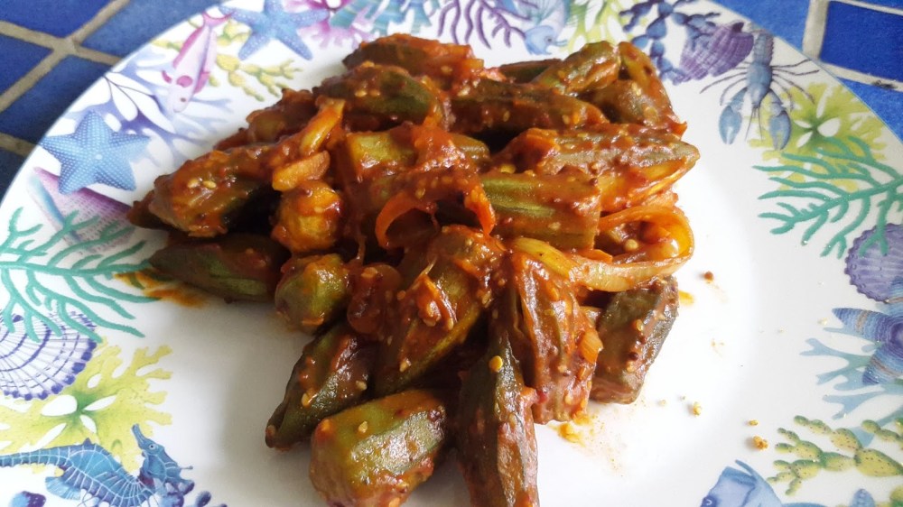 - In a medium size pan, heat the olive oil over medium-high heat, add the frozen okra, garlic, ginger, and mustard seeds.allow to cook about 20 seconds then add the curry powder, chili flakes, onions, and tomato puree, cook about 1 minute, stirring frequently.