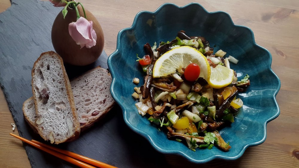 - Pour the olive dressing over the aubergine mixture then pour the lemon juice and sprinkle the cilantro and salt to taste, mix gently.
