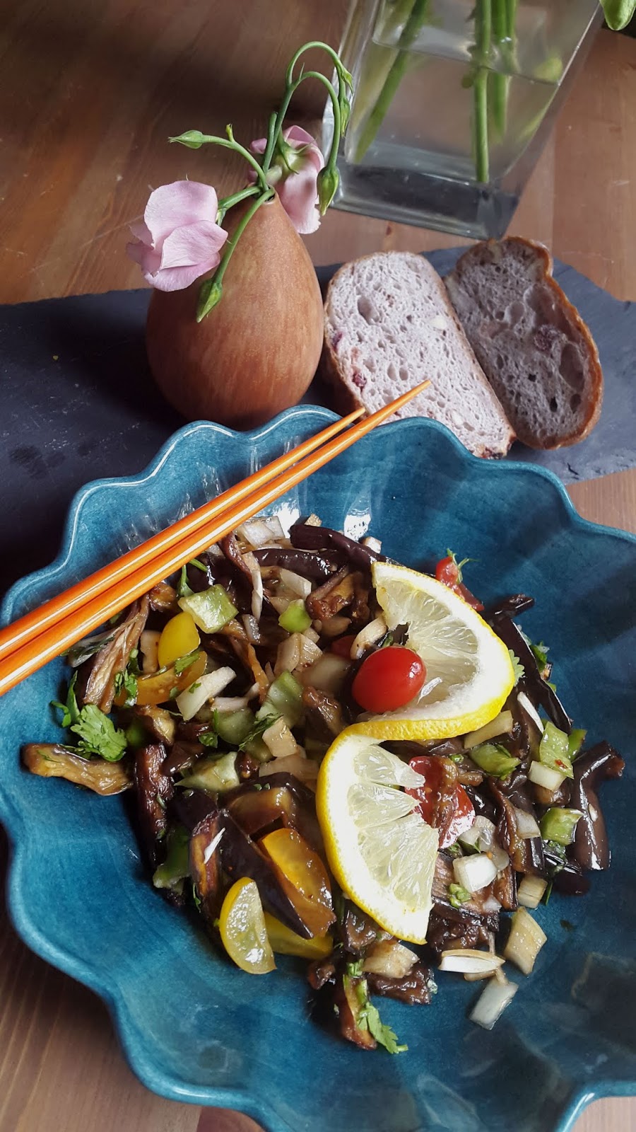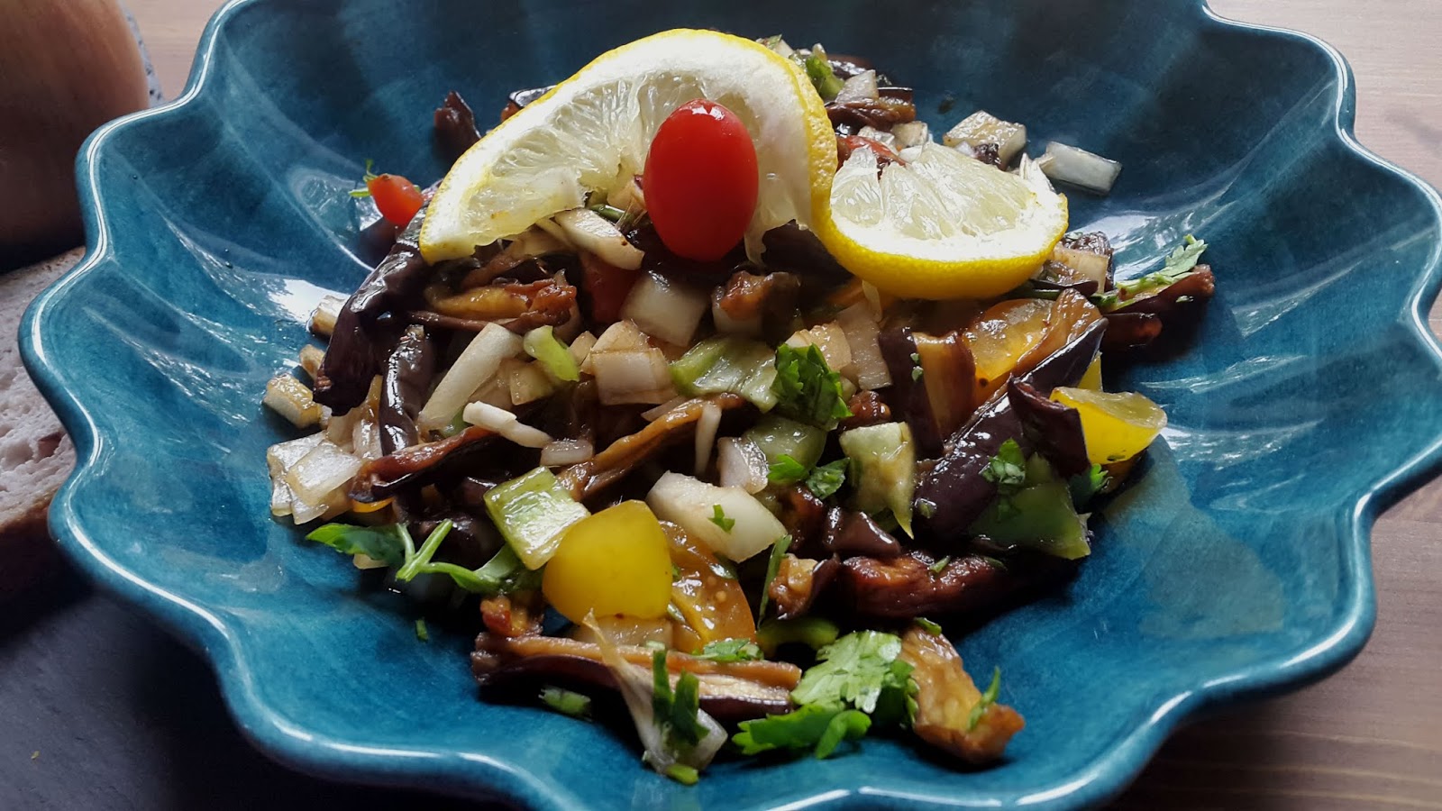 - Pour the olive dressing over the aubergine mixture then pour the lemon juice and sprinkle the cilantro and salt to taste, mix gently.